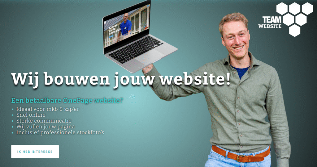 Bij TEAM Website helpen we ZZP’ers en MKB-ondernemers om professioneel online zichtbaar te zijn. Of je nu een snelle, betaalbare one-page-website zoekt of een volledig op maat gemaakte oplossing, wij zorgen ervoor dat jouw website aansluit bij jouw bedrijf én jouw doelen. Met een moderne website maak je niet alleen indruk, maar bouw je ook aan het succes en de toekomst van je onderneming. Wil je een voorproef van een one-page-website, zie onze eigen gemaakte TEAM Website: www.teamwebsite.nl.
