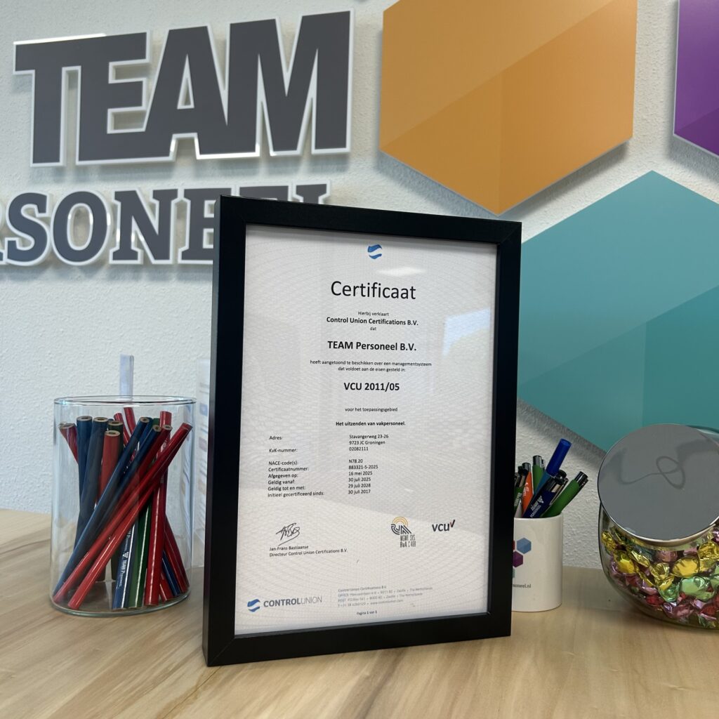 Goed nieuws: ons VCU-certificaat is opnieuw verlengd! Op 16 mei 2025 is het certificaat officieel afgegeven. Een mooie bevestiging dat wij als TEAM Personeel veilig en verantwoord werken in onze samenwerking met uitzendkrachten en opdrachtgevers in risicovolle sectoren zoals bouw en techniek.